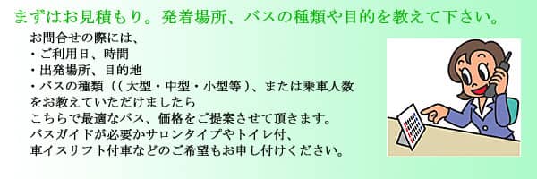 お申し込の際には、ご利用日、配車時間、最遠地、バスの種類(大型・中型・小型等)、