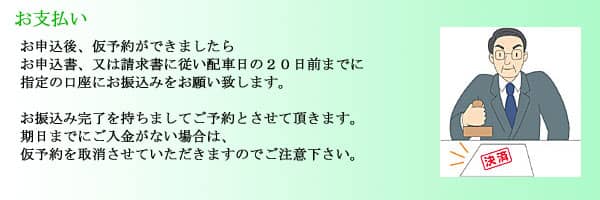 指定の口座に指定期日(配車日の20日前)までにお振込みをお願い致します。