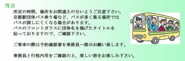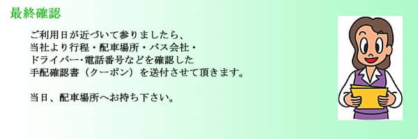 ご利用日が近づいて参りましたら、当社より行程・配車場所・バス会社・